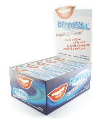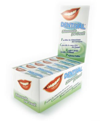 Pasta dentifricia ad azione sbiancante da utilizzare due volte alla settimana per eliminare macchie sui denti dovute al fumo o a residui di cibo ecc. Utilizzando il DENTIVAL costantemente il colore dei denti può essere aiutato a non variare e alcuni dei componenti possono avere azioni preventive su carie e placca. Tutto ciò è sinergico all'azione quotidiana dello spazzolino e dell'utilizzo almeno due volte al giorno di DENTIVAL gengidentifricio gel-antipalcca.